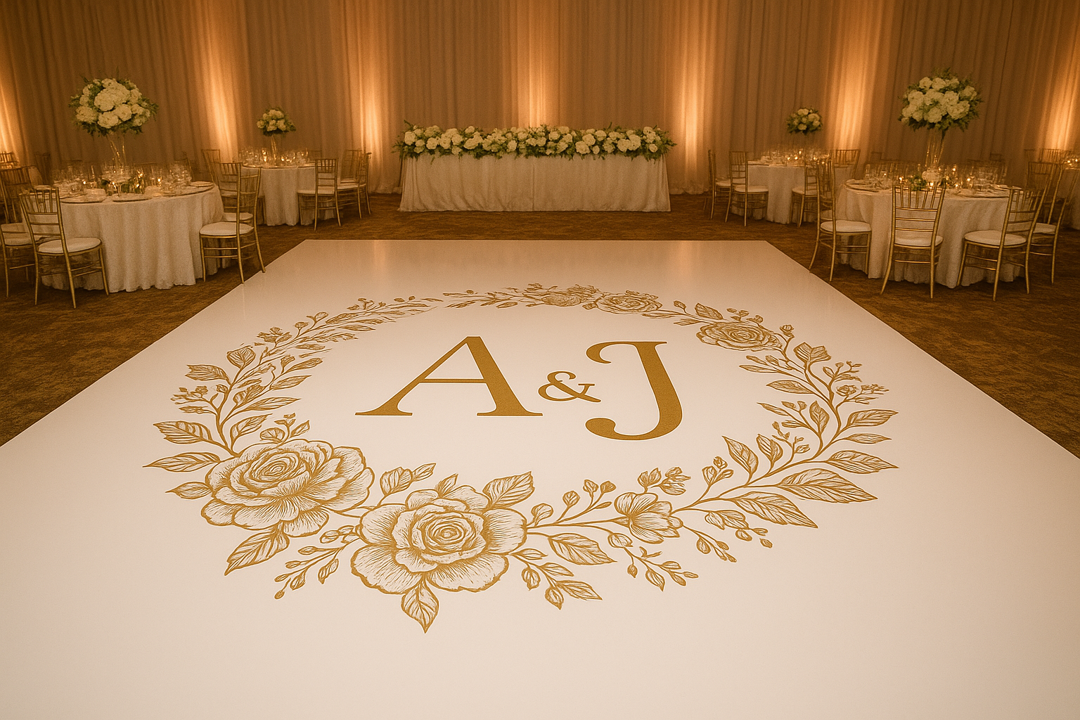 Our team custom designs dance floor wraps to transform your dance floor into a stunning centerpiece. We collaborate with you to design a floor wrap that enhances your décor, reflects your style, and makes a memorable impact on your guests. We’ll take care of everything from design to installation.
